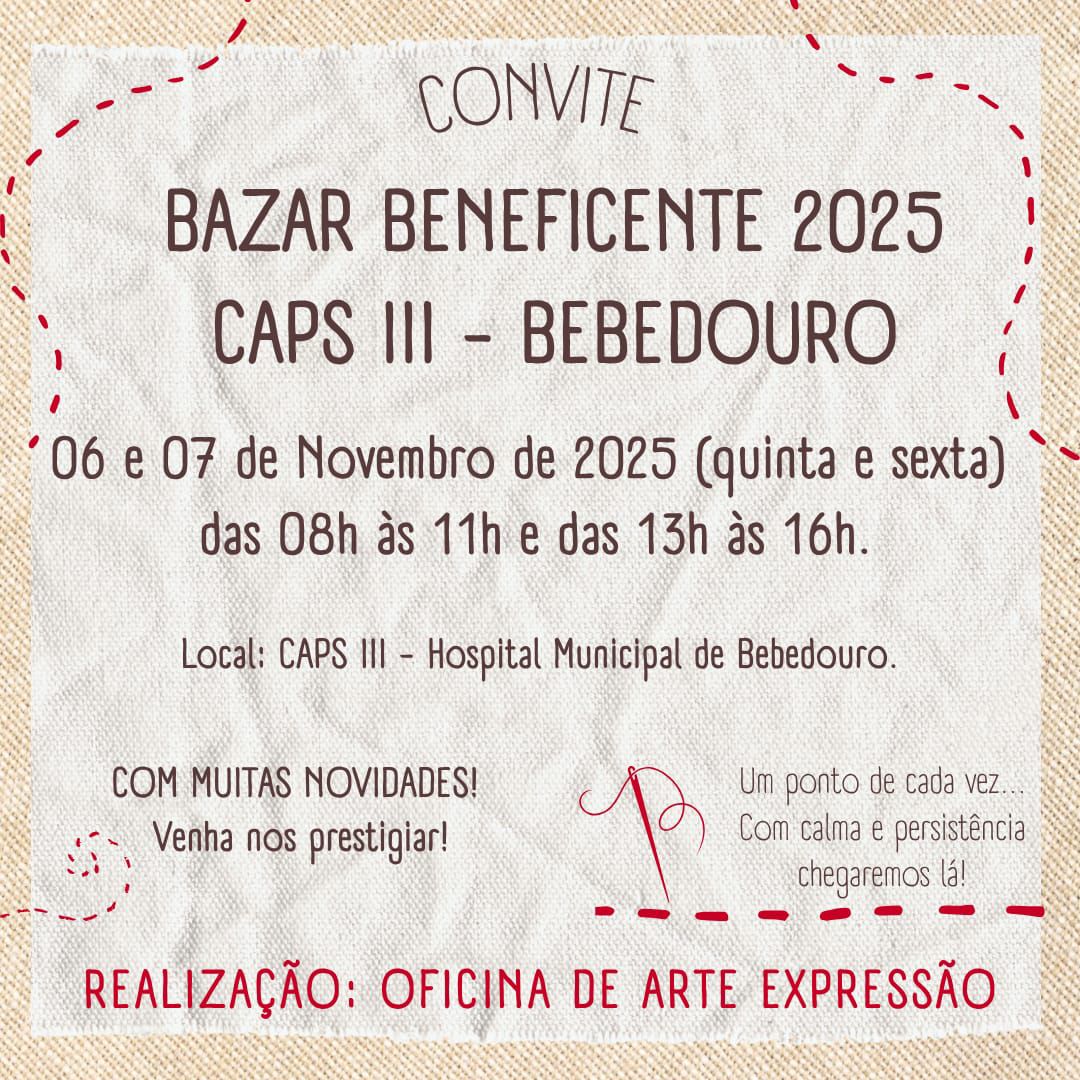 Prefeitura e Secretaria Municipal de Saúde convidam para o bazar beneficente, nesta quinta e sexta-feira (6 e 7/11), das 8h às 11h e das 13h às 16h, no Caps III, instalado no Hospital Municipal de Bebedouro. Realização da Oficina de Arte Expressão, com novidades produzidas por usuários do centro de atendimento.