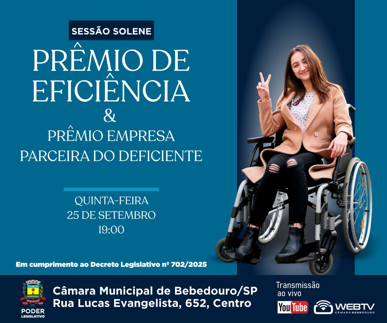 Em sessão solene, nesta quinta-feira (25/9), às 19h, em sua sede, a Câmara de Bebedouro entrega o Prêmio de Eficiência e o Prêmio Empresa Parceira do Deficiente a que têm dado a sua contribuição para a inclusão dos deficientes.