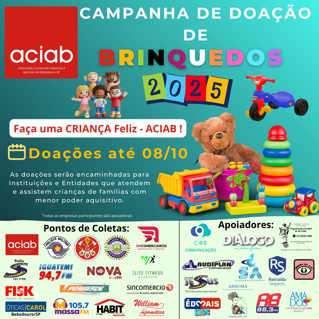 Em realização, campanha de doação de arrecadação de brinquedos, novos e/ou usados, denominada “Faça uma Criança Feliz – Aciab” e encabeçada pela Associação Comercial, Industrial e Agrícola. Distribuição a cargo de entidades locais que atendem crianças de famílias com menor poder aquisitivo.