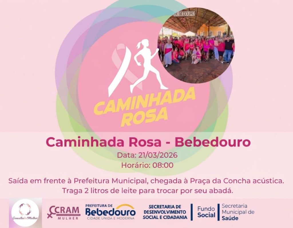 Prefeitura, secretarias municipais de Desenvolvimento Social e Cidadania e de Saúde, Fundo Social, Cram, Casa da Mulher e Conselho da Mulher promovem, neste sábado (21/3), com início às 8h, a Caminhada Rosa. Saída da Praça Valêncio de Barros, com percurso até a Concha Acústica. Objetivos: conscientização, cuidado com a saúde e promoção do bem-estar, em […]