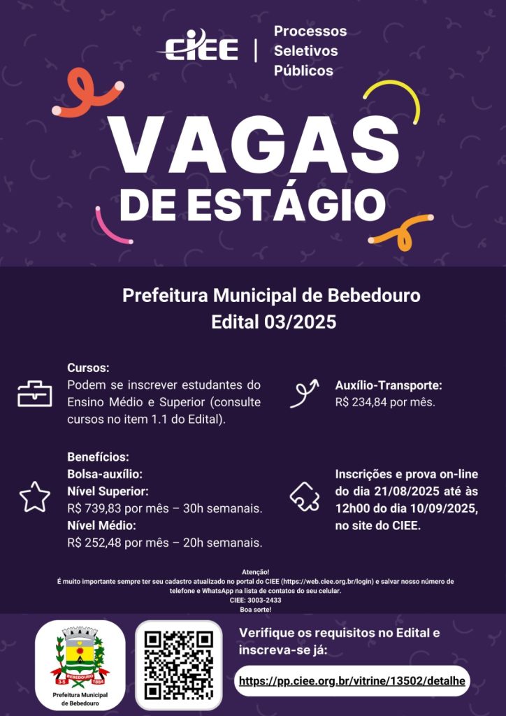 Prefeitura de Bebedouro anuncia processo seletivo para preenchimento de vagas de estágio. Destinam-se a estudantes regularmente matriculados no ensino médio ou superior. Inscrições e provas on-line, até o dia 10 de setembro, às 12h, no site www.ciee.org.br – https://pp.ciee.org.br/vitrine/13502/detalhe Bolsa-auxílio de R$ 739,83 mensais para nível superior, com jornada de 30h semanais – e de […]