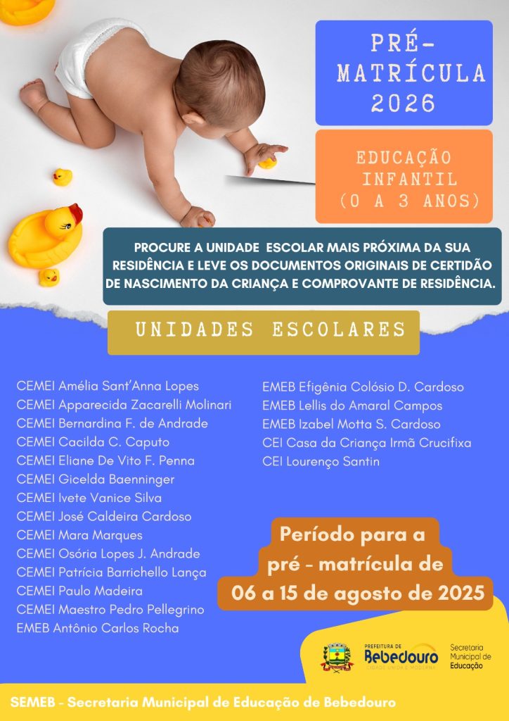 Prefeitura de Bebedouro e Secretaria Municipal de Educação, entre esta quarta-feira (6/8) e 15 de agosto, divulgam o período de pré-matrículas para crianças de 0 a 3 anos, que ingressarão na Educação Infantil I (creche) da rede municipal em 2.026. Os pais ou responsáveis devem se dirigir à escola mais próxima de onde residem, das […]