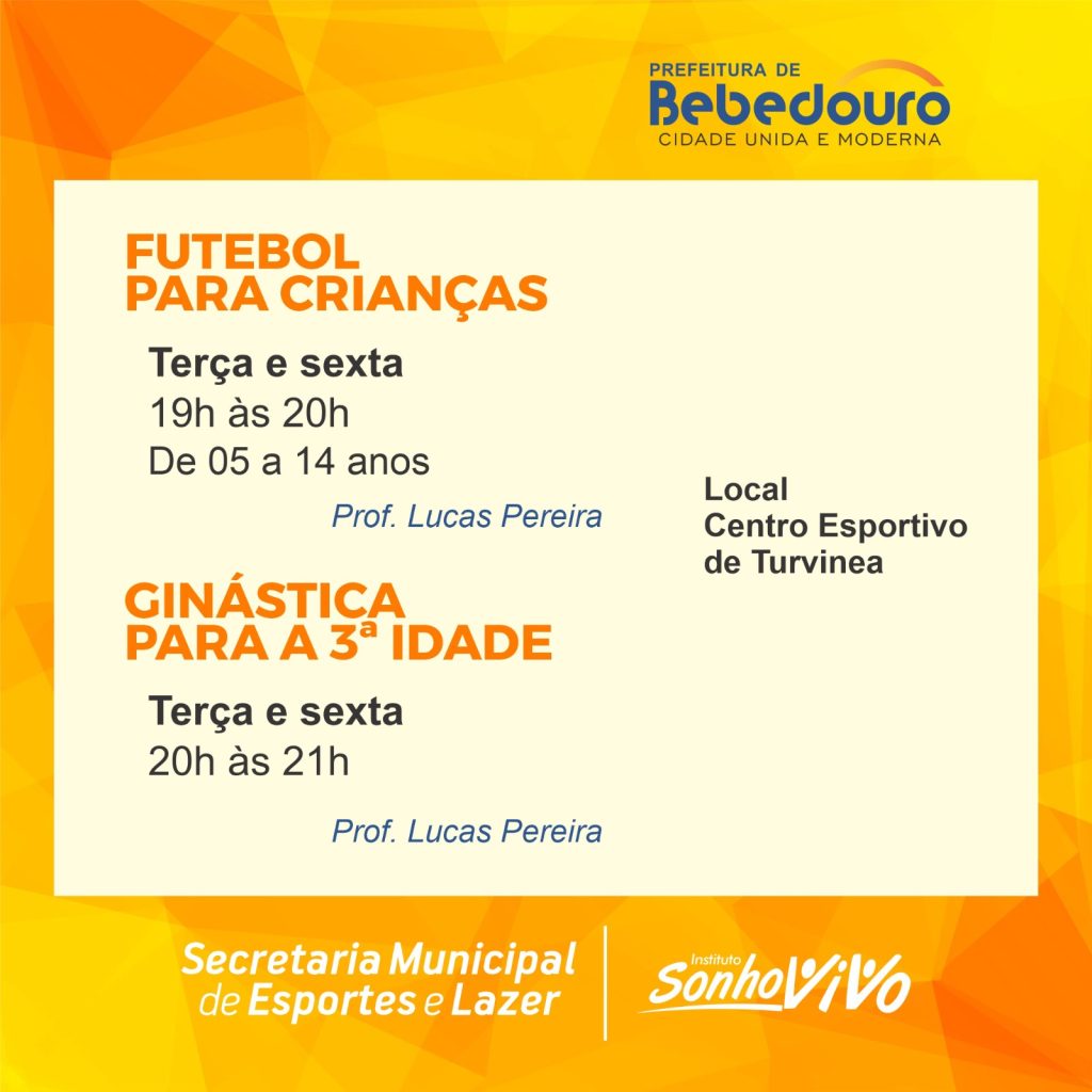 Prefeitura e Secretaria Municipal de Esportes e Lazer oferecem atividades esportivas gratuitas no Centro Esportivo de Turvínea, em prol de saúde, lazer e qualidade de vida de crianças e idosos. Aulas a cargo do professor Lucas Pereira. Futebol 📅 Terça e sexta-feira. ⏰ 19h às 20h. Idade: de 5 a 14 anos. Ginástica para a […]