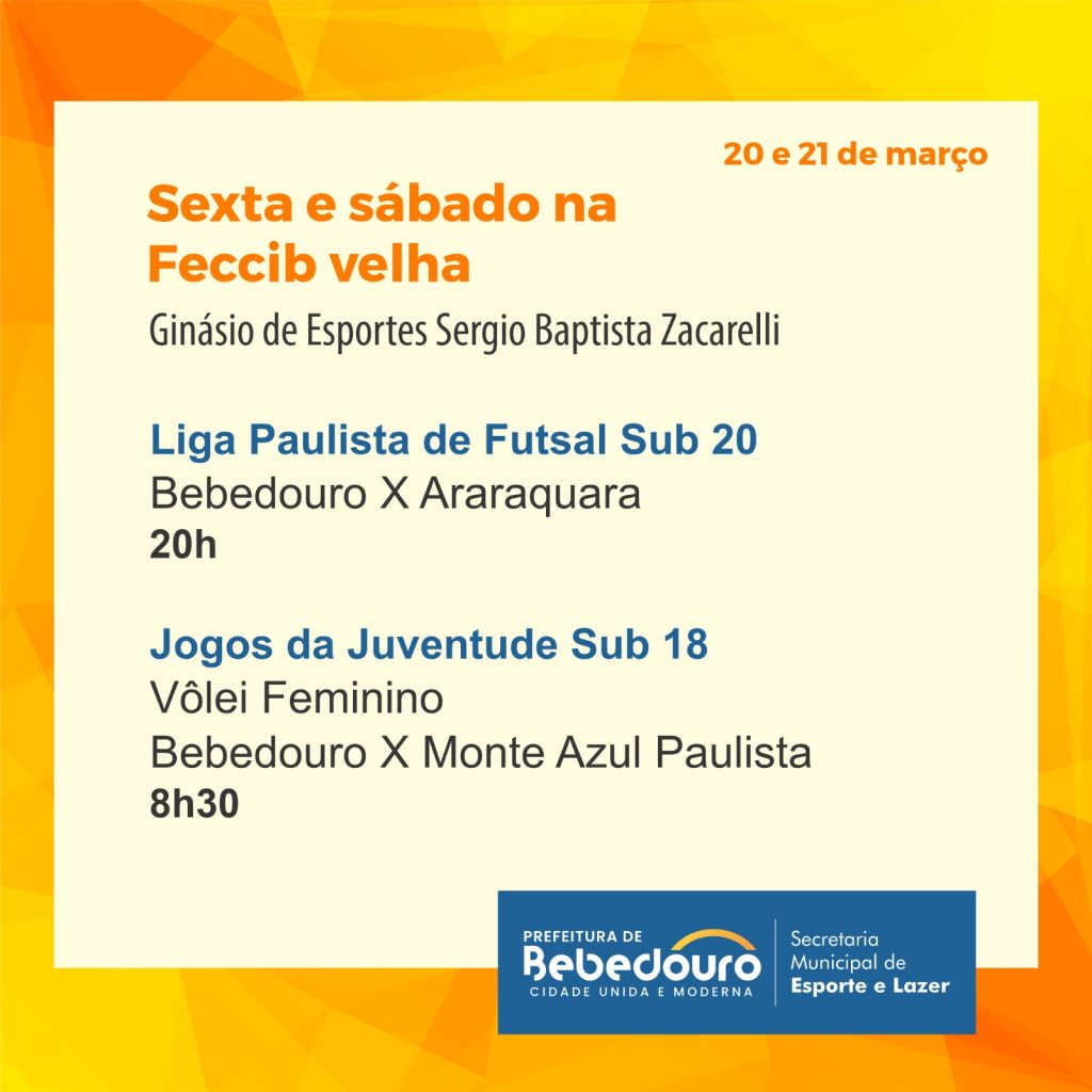Prefeitura e Secretaria Municipal de Esportes e Lazer anunciam jogos para o Ginásio “Sérgio Zacarelli”, no Jd. Casagrande, em Bebedouro. Nesta sexta-feira (20/3), às 20h, pela Liga Paulista de Futsal, sub-20 de Bebedouro X Araraquara. Sábado (21/3), às 8h30, pelos Jogos Femininos da Juventude, voleibol sub-18 de Bebedouro X Monte Azul Paulista. É compromisso do […]