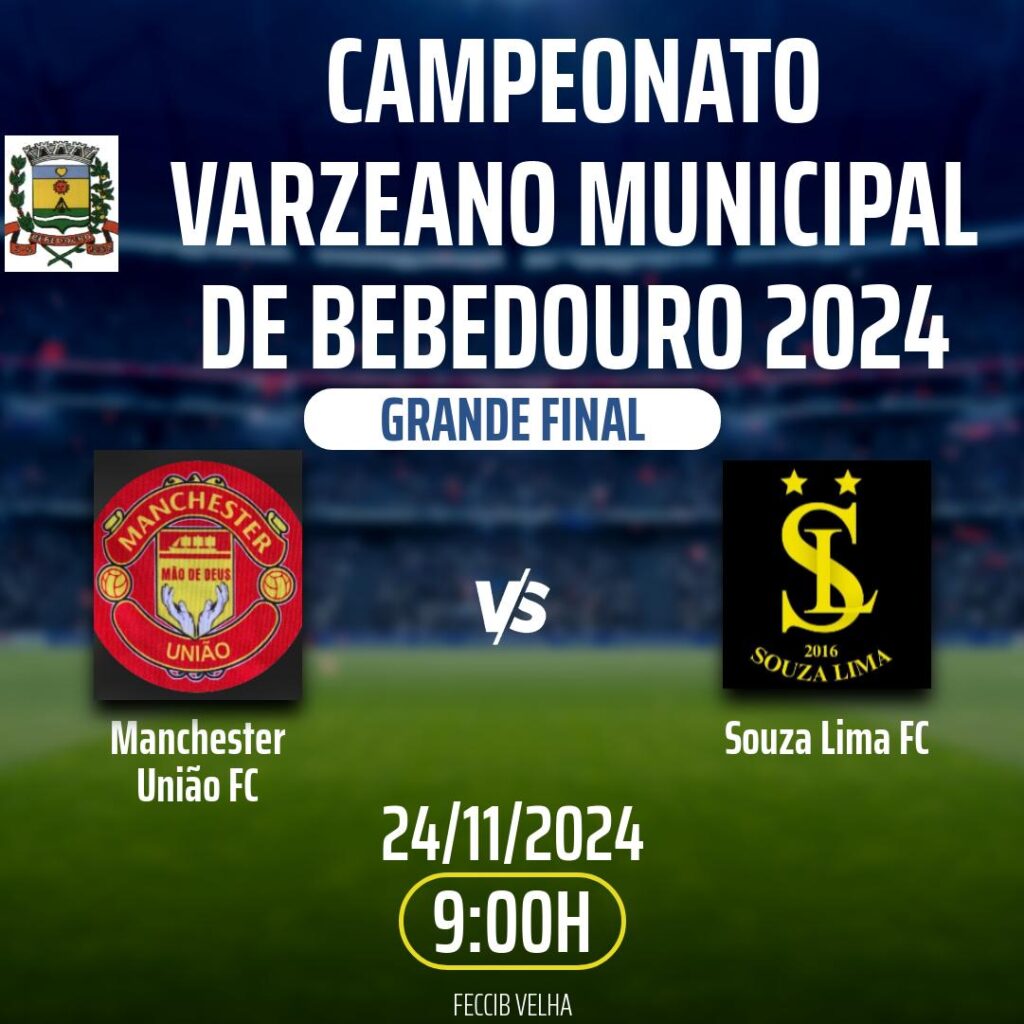 Prefeitura e Secretaria de Esportes confirmam para domingo (24/11), às 9h, no Stamatão, no Jd. Casagrande, a grande final do Municipal de Futebol Varzeano 2.024 de Bebedouro. O Manchester União e o Souza Lima decidem o título da competição. Prestigie! Fonte: Assessoria de Imprensa.