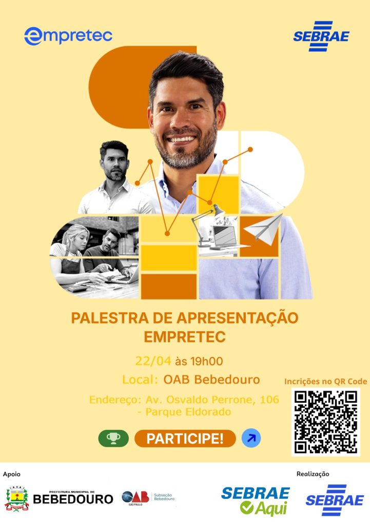 Prefeitura, Secretaria Municipal de Desenvolvimento Econômico e Sebrae Aqui Bebedouro convidam empreendedores para o Curso “Turbine seu Negócio”, de capacitação prática, voltada ao fortalecimento e ao crescimento de empresas. Serão quatro dias de imersão, com conteúdo estratégico para quem deseja melhorar resultados, ampliar vendas e desenvolver o próprio negócio. Aulas de 11 a 14 de […]