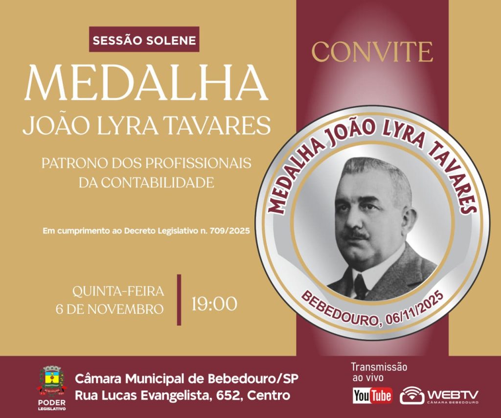 Em cumprimento ao Decreto Legislativo nº 709, de 20 de outubro de 2.025, Câmara de Bebedouro promove sessão solene, nesta quinta-feira (6/11), às 19h, em sua sede, para entrega a contabilistas da Medalha “João Lyra Tavares”, deputado federal e senador, falecido aos 90 anos, vítima de covid-19. Condecoração instituída por propositura do vereador Paulo Bola […]