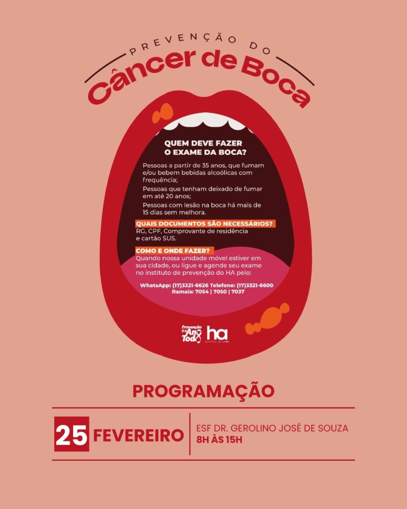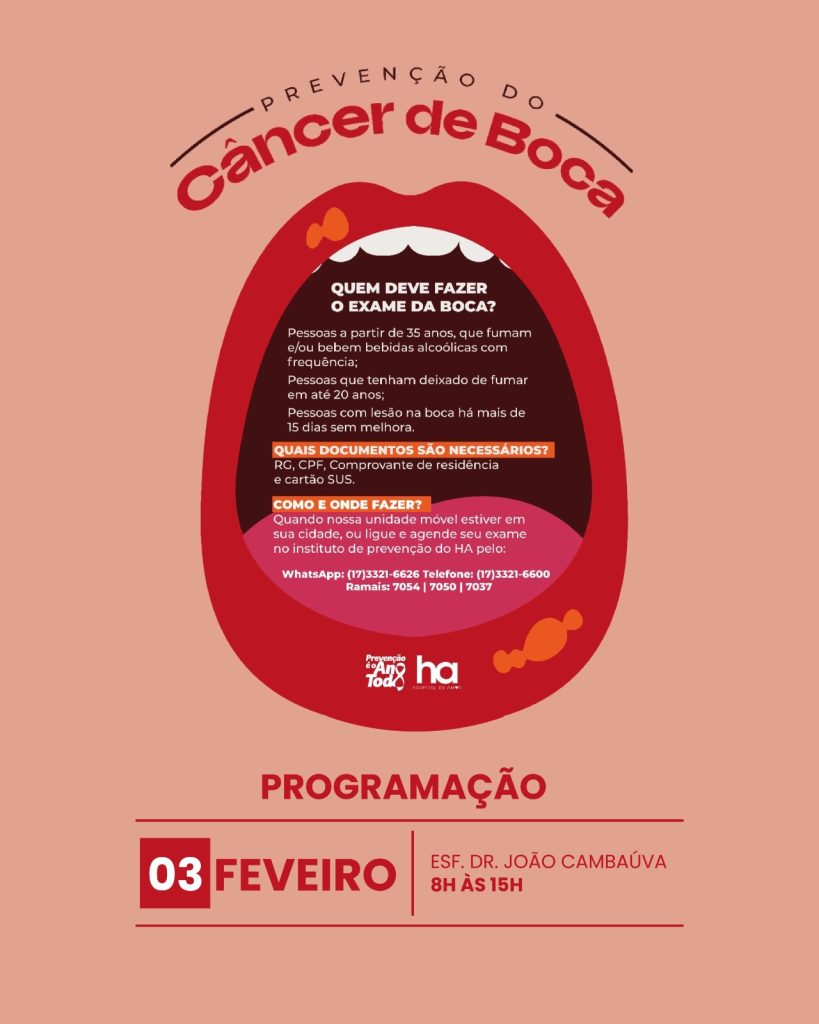 Prefeitura, Secretaria Municipal de Saúde e Depto. de Odontologia, nesta terça-feira (3/2), iniciam a Campanha de Prevenção ao Câncer Bucal 2.026, em parceria com o Hospital de Amor de Barretos. Atendimentos na ESF “João Cambaúva”, das 8h às 15h, com foco no diagnóstico precoce da doença, para conscientizar a população sobre a importância da prevenção. […]