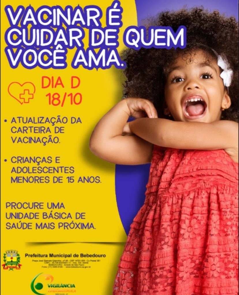 Prefeitura de Bebedouro e Secretaria Municipal de Saúde, neste sábado (18/10), das 8h às 16h, coordenam o “Dia D de Multivacinação” em todas as UBSs do município. Objetivo: atualizar a caderneta de vacinação de crianças e adolescentes menores de 15 anos, como forma de prevenção contra diversas doenças. Pais e responsáveis devem comparecer à unidade […]