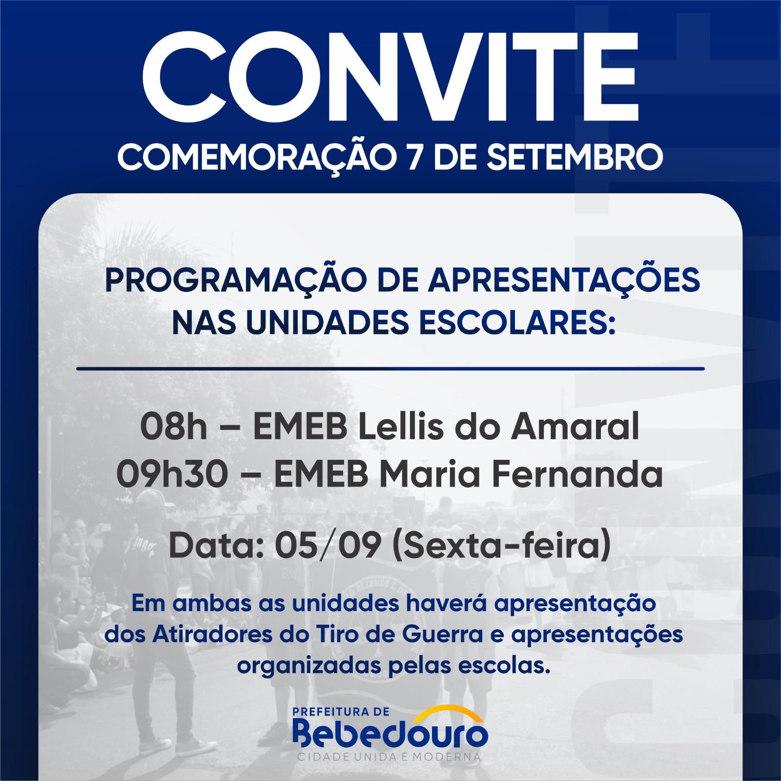 Para 5 de setembro (sexta-feira), a Secretaria de Educação de Bebedouro anuncia a celebração à Independência do Brasil (data oficial em 7/9), com apresentações cívicas em unidades escolares. A programação terá início às 8h, na Emeb “Lellis do Amaral Campos” – seguirá às 9h30, na Emeb “Maria Fernanda Lopes Piffer”.