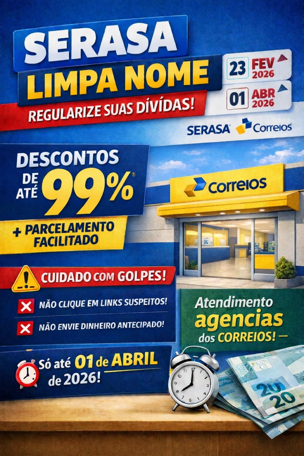 Prefeitura de Bebedouro, Procon Municipal e Correios realizam o “Serasa Limpa Nome”, com prazo até 1º de abril. Consumidores têm a oportunidade de renegociar dívidas com descontos que podem chegar a 99%. No entanto, quem optar por pagamento em várias vezes deve manter as parcelas em dia, pois o atraso pode cancelar o acordo e fazer com que a dívida retorne ao valor original. O atendimento é grátis, presencialmente, em uma agência dos Correios, mediante a apresentação de documento pessoal.