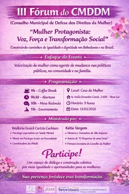 Prefeitura de Bebedouro e Secretaria de Desenvolvimento Social e Cidadania anunciam para esta sexta-feira (13/3), o 3º Fórum do Conselho Municipal de Defesa dos Direitos da Mulher (CMDDM). Tema: “Mulher Protagonista: Voz, Força e Transformação Social”, com destaque para a construção de uma sociedade mais justa e igualitária. O evento acontece às 9h, na Casa da Mulher, localizada na Av. Amélia Bernardini Cutrale (anel viário)