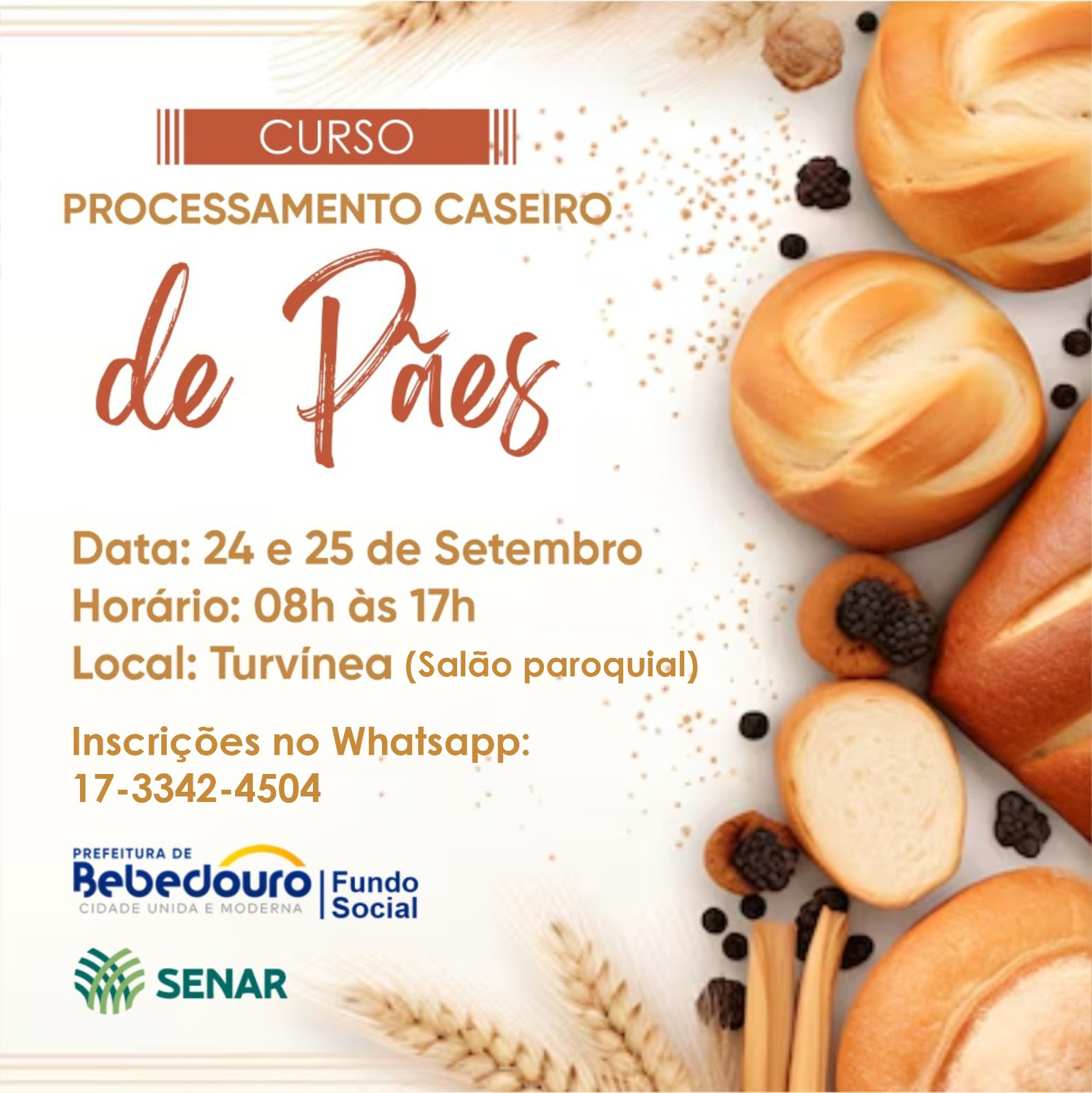 Prefeitura, Fundo Social, Senar e Sindicato Rural oferecem mais uma oportunidade de aprendizado gratuito para a população, agora no distrito de Turvínea. Nesta quarta e quinta-feira (24 e 25/9), das 8h às 17h, no Salão Paroquial, acontece o Curso de Pães.