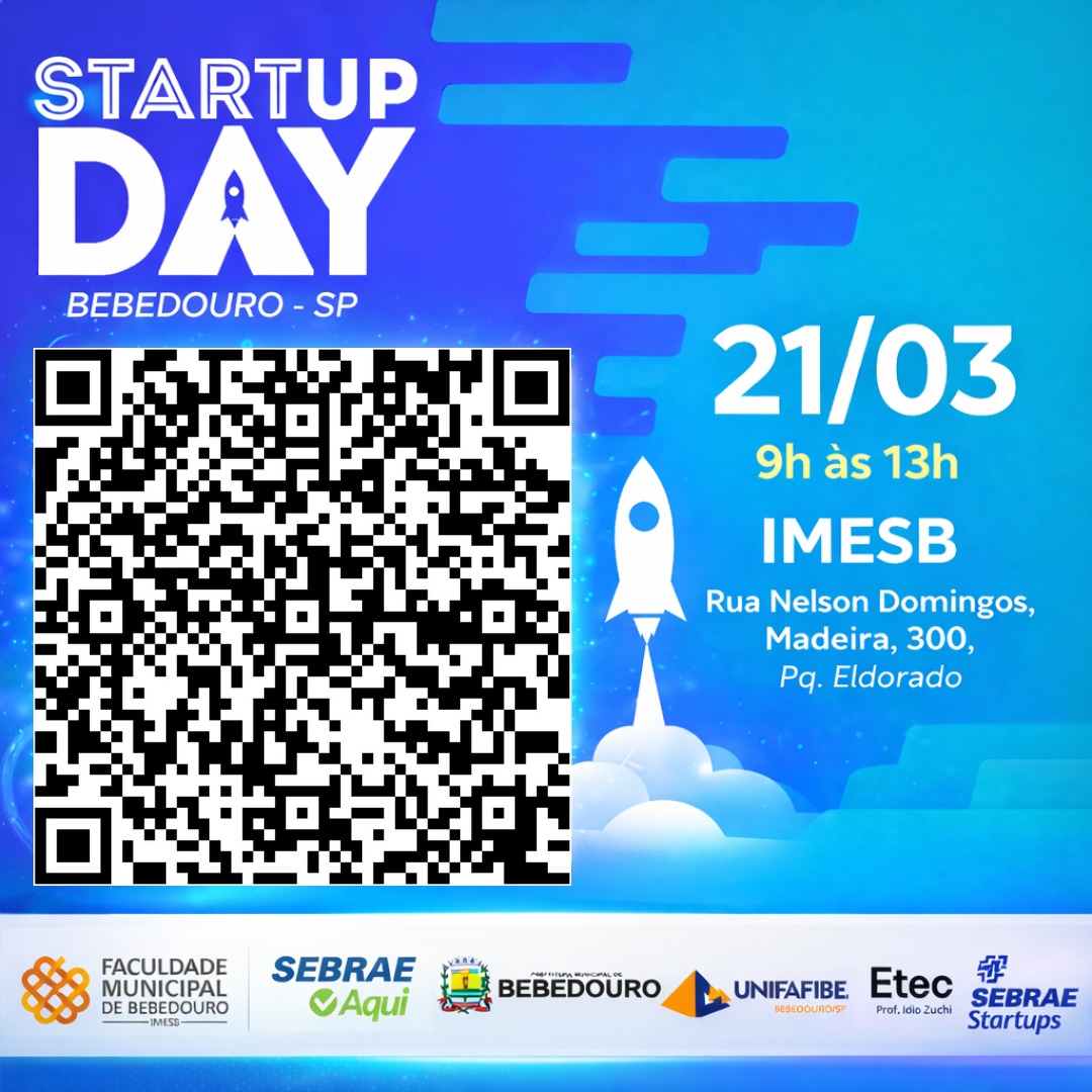 O evento será neste sábado (21/3), das 9h às 13h, no Imesb – Faculdade Municipal de Bebedouro, à Rua Nelson Domingos Madeira, 300, no Parque Eldorado (zona oeste). Inscrição pelo link https://www.sympla.com.br/evento/startup-day-2026—bebedouro/3290749.